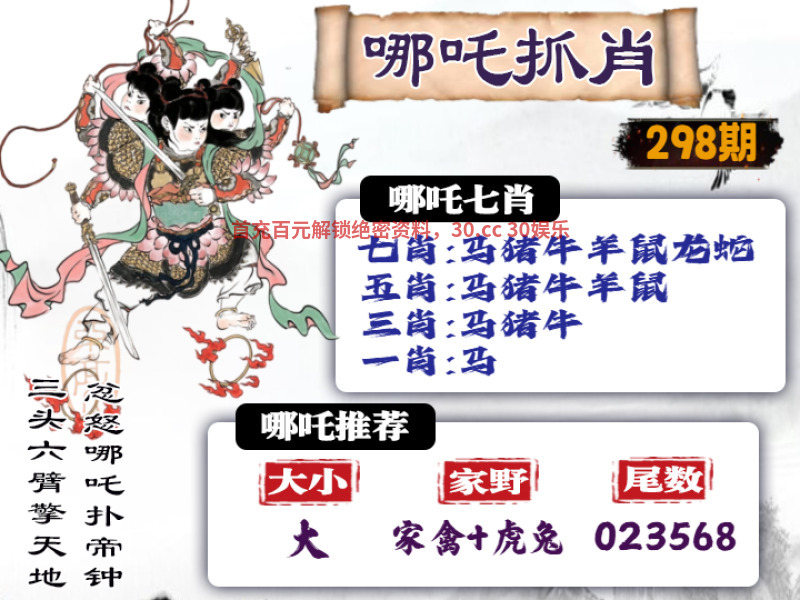 | 300期: ①七肖中特:猪虎牛蛇马鼠猴 ②大小中特:大数 ④精准六尾:012458 |