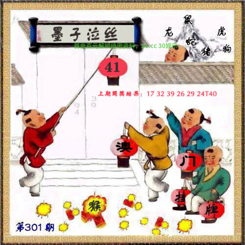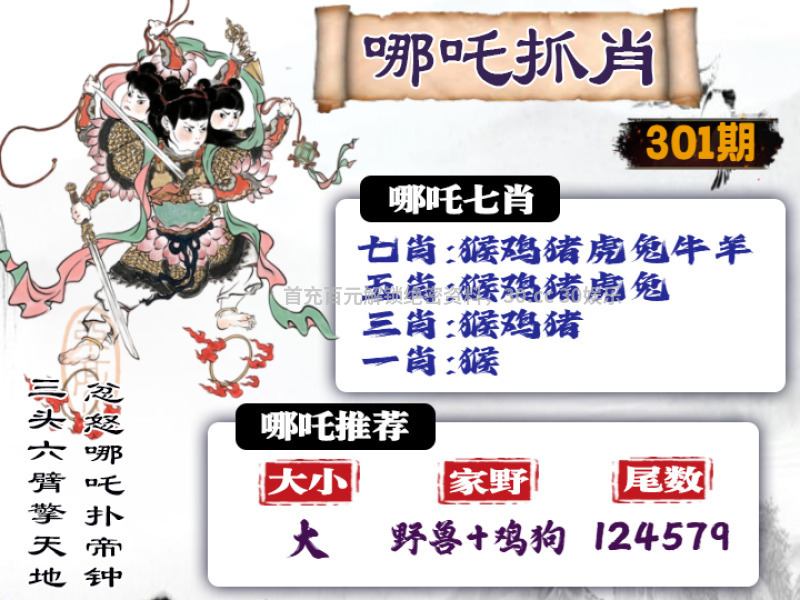 | 301期: ①七肖中特:猴鸡猪虎兔牛羊 ②大小中特:大数 ③家野+2肖:野兽+鸡狗 ④精准六尾:124579 |